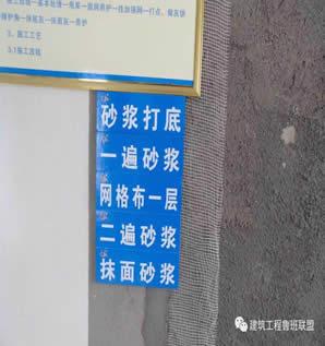 施工工藝流程明確后由現場技術負責人編寫施工 方案和質量控制要點,監理編制監理實施細則和 質量檢查標準,經審核后由總包單位實施,制作 樣板時要顯示每道工藝的結果,由一系列樣板組 抹灰樣板 水泥地面樣板 成,而不僅僅是顯示完成面的情況。